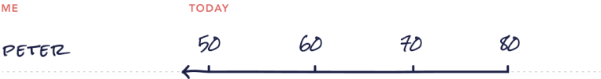 Throughout this exercise, I have included my own information as examples to illustrate the concepts, but I invite you to make this your own. Start by writing your name in the space labeled “Me.” Then, write your current age on the first dash. On each of the subsequent dashes, write the age you’ll be every 10 years, until you reach the age of average life expectancy—this is roughly 80 years for a healthy adult in the U.S. To finish, draw a line from today until 80.