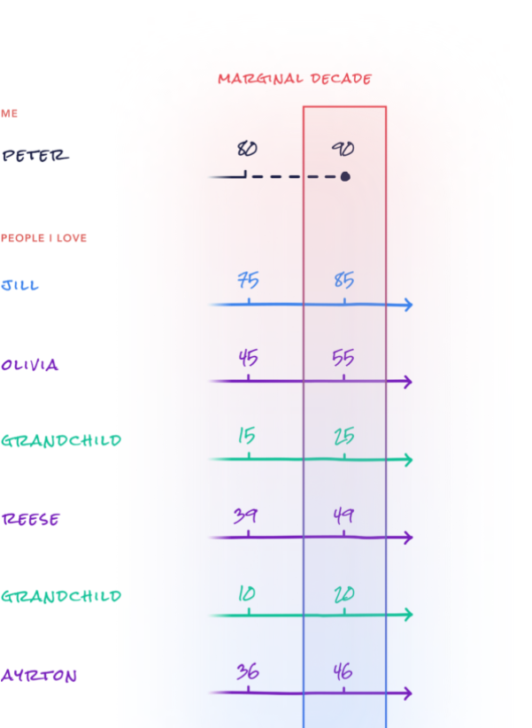 Then add one more decade of life to everyone else on your page. There’s no guarantee that this will happen, but how would things change in your Marginal Decade if it did? It would be a major understatement to say that this version of the chart is a reason to get excited. Think about the implications of that extra 10 to 20 years: the life events you will experience, the people you will get to meet, and the wisdom you will get to share. And if we do this right, those extra years will be spent in good health.