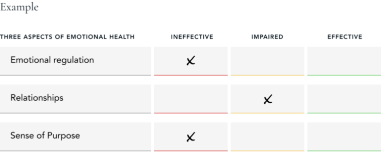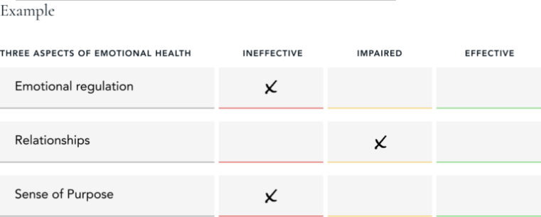 First, going back to the three aspects of emotional health from Lesson 12.2, reflect on the past week and for each category, mark the column that best describes your current emotional health.