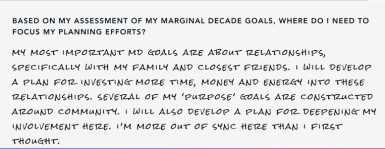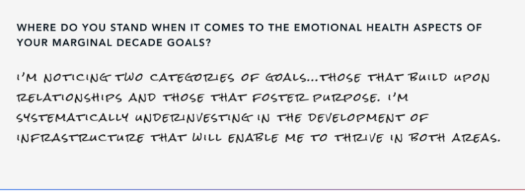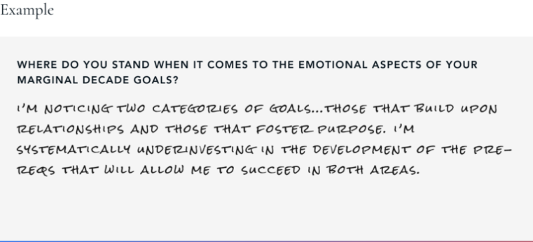 Once again, we’re returning to our Marginal Decade goals. In Modules 9 and 10, we asked you to decompose the physical aspects of your goals in order to make the assessment, “Am I performing at a high enough level today to achieve my goals tomorrow?” Here, we ask that you do the same assessment, but for the non-physical aspects. As things stand today, are you prioritizing the correct aspects to achieve your Marginal Decade goals?