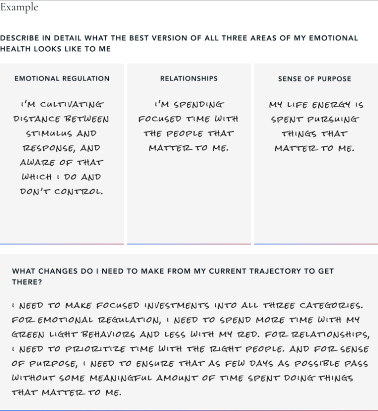 Think about what the best version of all three aspects of your emotional health (emotional regulation, relationships, sense of purpose) looks like to you. Record your answers in the worksheet.