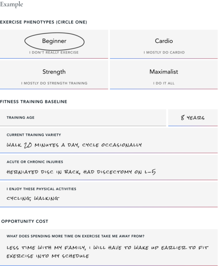 On the second page of the exercise worksheet, answer the following questions to figure out your exercise phenotype, fitness training baseline, and opportunity cost.