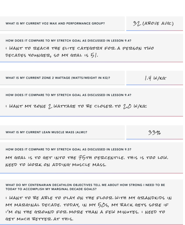 On the third page of the exercise worksheet, assess your current level of fitness and identify the gap between where you are where you want to be. You may need to complete some additional testing to get this information. Details on VO2 Max and Zone 2 testing and targets can be found in the video discussing Cardio programming. Details on ALMI testing can be found in Module 9 activity “DEXA Scan and Analysis.”